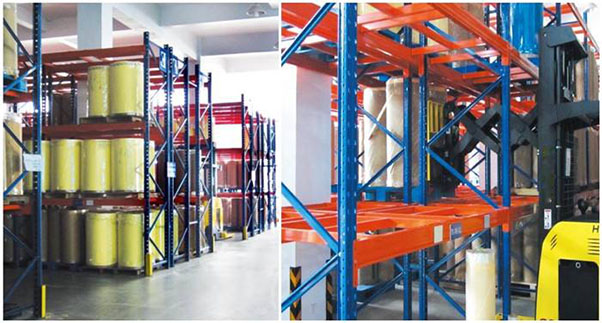 普通叉車搭配:一整棟式貨架,沒有專門的叉車通道,由叉車駛?cè)胴浖軆?nèi)部存取貨物。